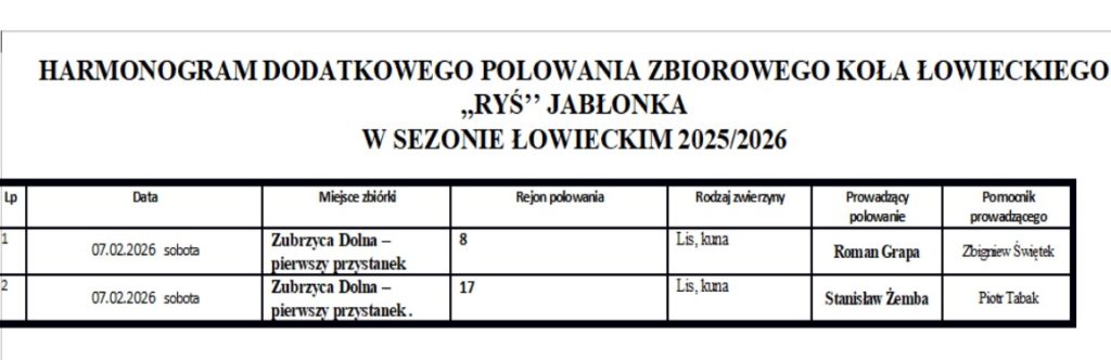 Powiatowe polowanie na drapieżniki 07.02.2026 Powiększ obraz Informujemy że Powiatowe Polowanie na drapieżniki odbędzie się 7 lutego (sobota). Autor: adminOpublikowano w dniu 26 stycznia 2026